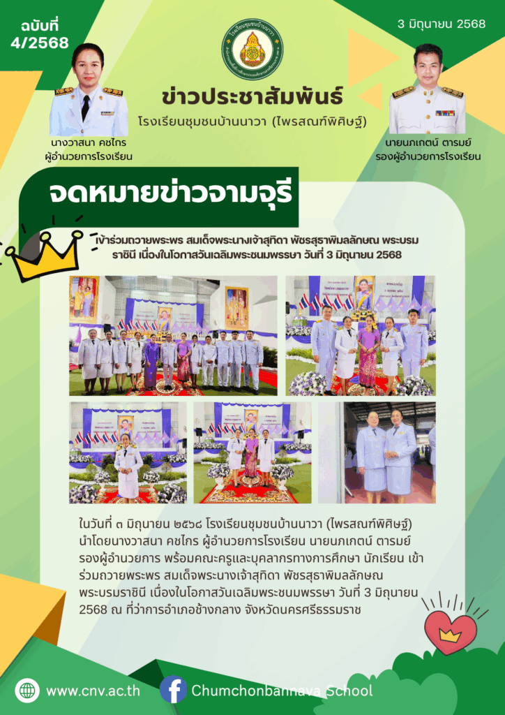 ในวันที่ ๓ มิถุนายน ๒๕๖๘ โรงเรียนชุมชนบ้านนาวา (ไพรสณฑ์พิศิษฐ์) นำโดยนางวาสนา คชไกร ผู้อำนวยการโรงเรียน นายนภเกตน์ ตารมย์ รองผู้อำนวยการ พร้อมคณะครูและบุคลากรทางการศึกษา นักเรียน เข้าร่วมถวายพระพร สมเด็จพระนางเจ้าสุทิดา พัชรสุธาพิมลลักษณ พระบรมราชินี เนื่องในโอกาสวันเฉลิมพระชนมพรรษา วันที่ 3 มิถุนายน 2568 ณ ที่ว่าการอำเภอช้างกลาง จังหวัดนครศรีธรรมราช