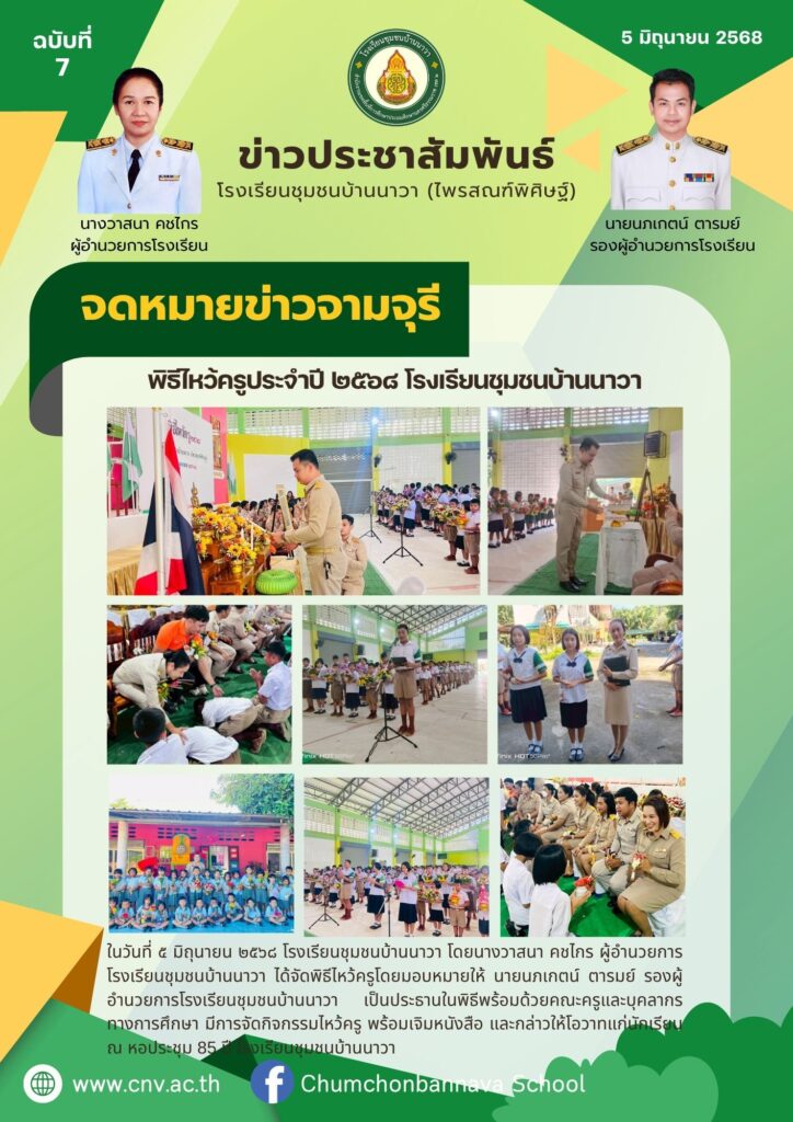 ในวันที่ ๕ มิถุนายน ๒๕๖๘ โรงเรียนชุมชนบ้านนาวา โดยนางวาสนา คชไกร ผู้อำนวยการโรงเรียนชุมชนบ้านนาวาได้จัดพิธีไหว้ครูโดยมอบหมายให้ นายนภเกตน์ ตารมย์ รองผู้อำนวยการโรงเรียนชุมชนบ้านนาวา เป็นประธานในพิธีพร้อมด้วยคณะครูและบุคลากรทางการศึกษา มีการจัดกิจกรรมไหว้ครู พร้อมเจิมหนังสือ และกล่าวให้โอวาทแก่นักเรียน ณ หอประชุม 85 ปี โรงเรียนชุมชนบ้านนาวา 05/06/2025 admin จดหมายข่าว 0